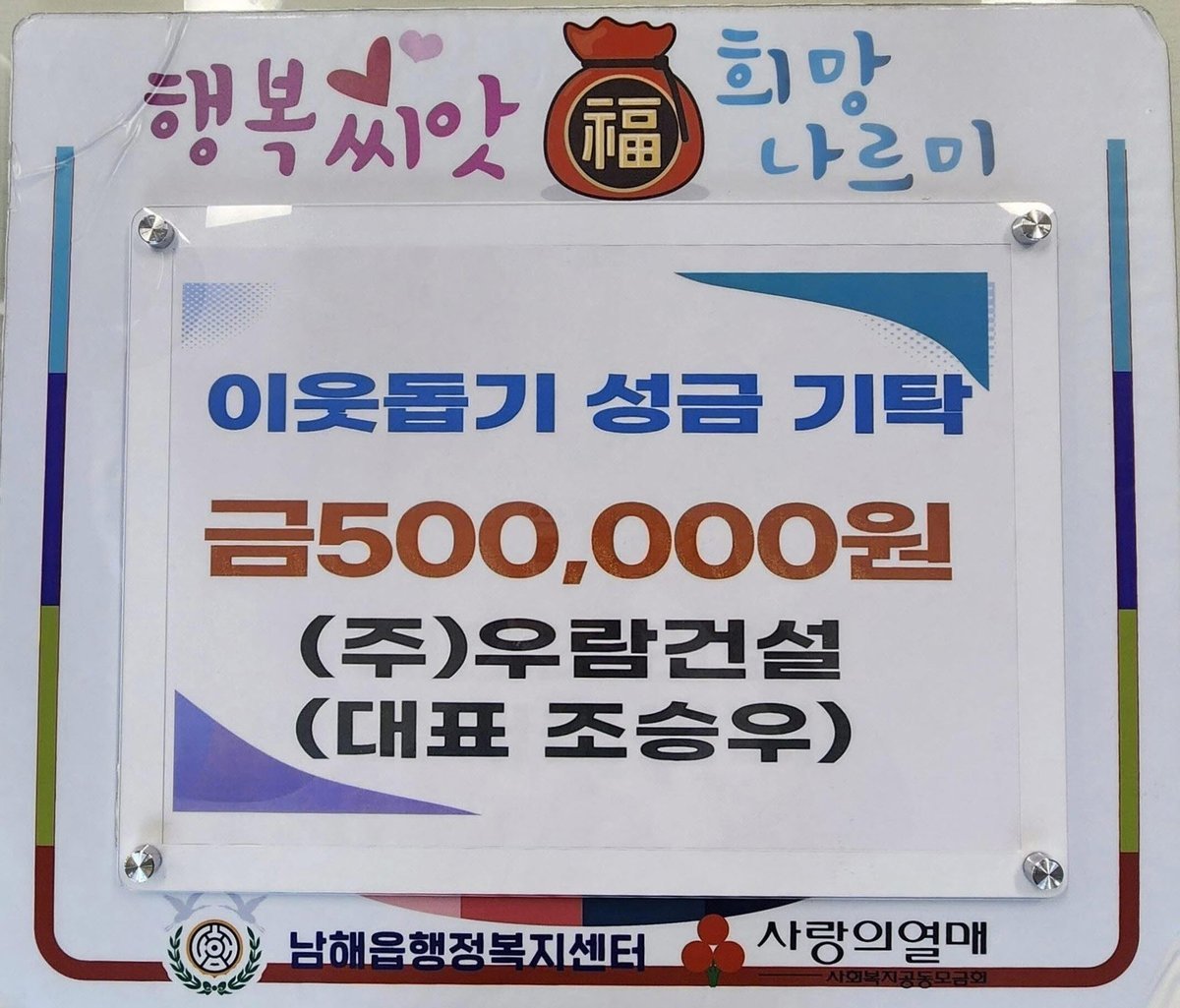 우람건설은 남해읍에 위치한 대표적인 건설업체로 매년 성금을 꾸준히 기탁하며 지역사회의 발전과 나눔문화 실천에 앞장서는 업체로, 지속적인 사회공헌 활동을 실천해 오고 있다.