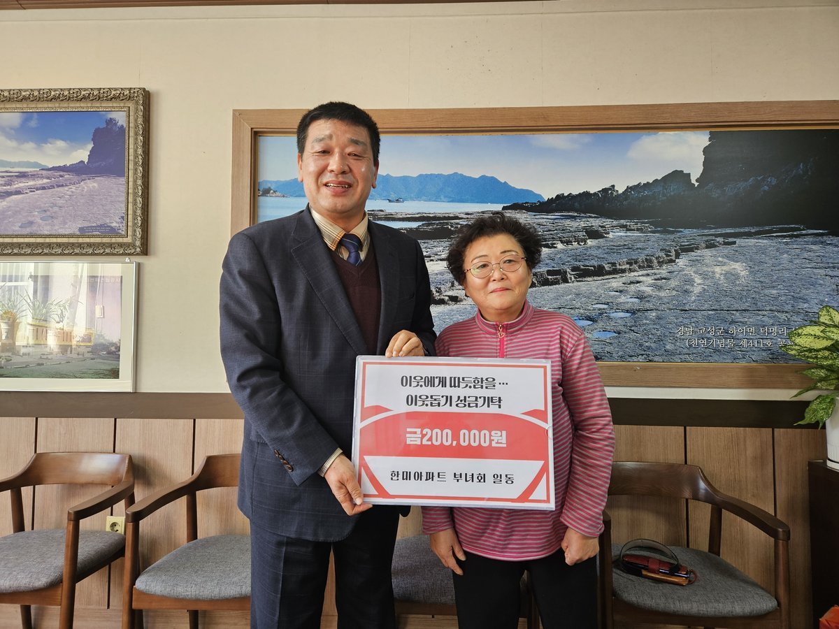 [한국Q뉴스] 고성군 하이면 한미아파트부녀회에서는 연말연시를 맞이하여 1월 2일, 하이면사무소를 방문하여 어려운 이웃에게 사용해 달라면 이웃돕기 성금 20만 원을 기탁했다.