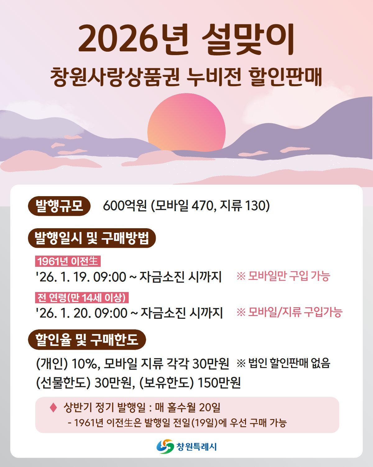 [한국Q뉴스] 창원특례시는 지역 내 소비 촉진과 소상공인 매출 증대를 위해 2026년 설 명절을 맞아 창원사랑상품권 '누비전'600억 원을 발행한다고 7일 밝혔다.