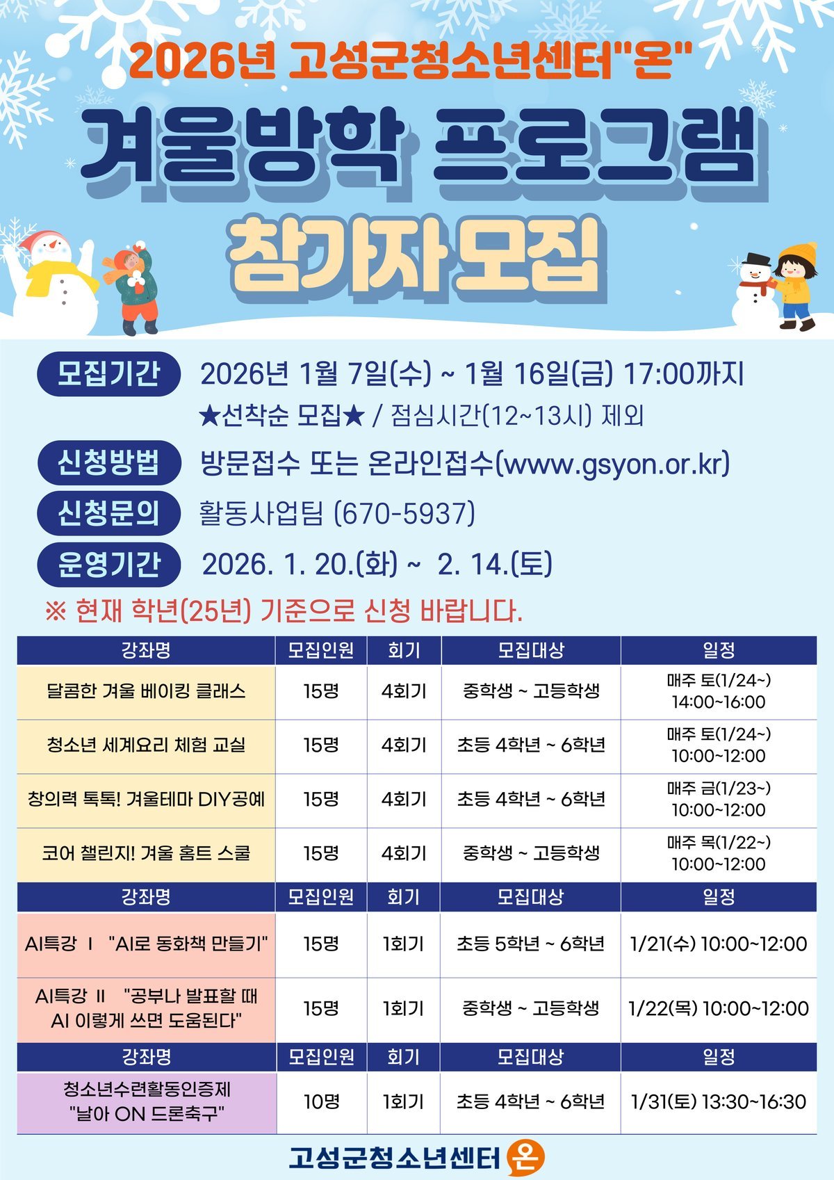 [한국Q뉴스] 고성군청소년센터“온”은 겨울방학을 맞이한 관내 청소년들을 대상으로 2026년 1월 20일부터 2월 14일까지 2026년 겨울방학 프로그램 및 특강을 운영한다.