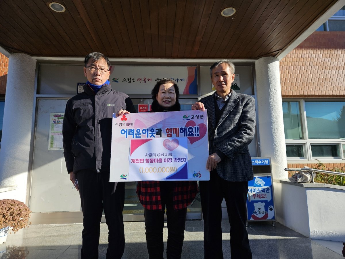 [한국Q뉴스] 고성군 개천면 청동마을 이장 박정자는 1월 6일 개천면사무소를 방문하여 관내 어려운 이웃을 위해 써달라며 이웃돕기 성금 100만 원을 기탁했다.