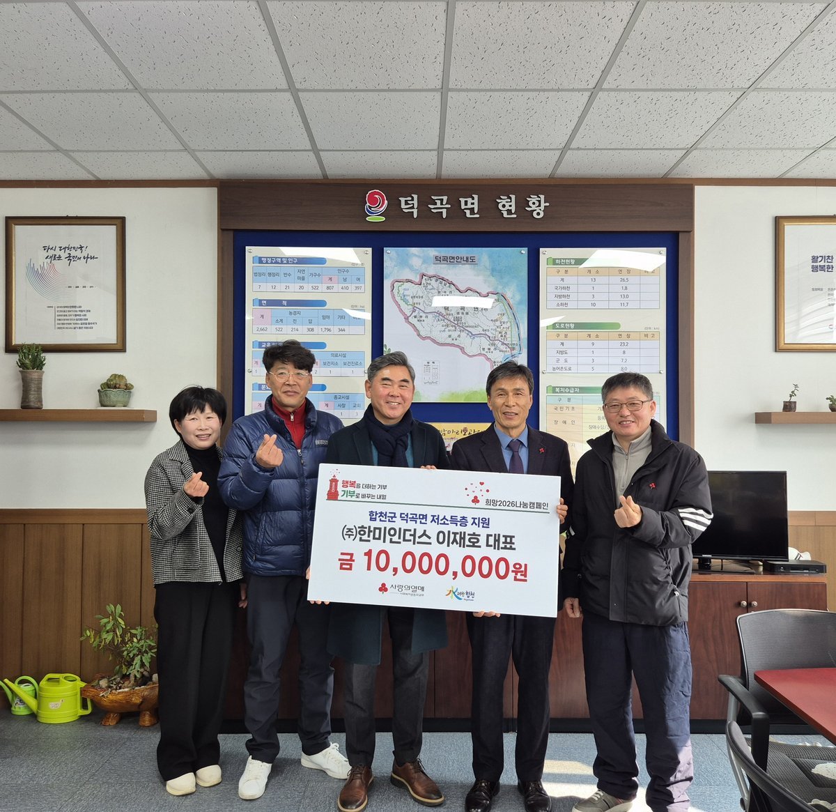 [한국Q뉴스] 합천군 덕곡면은 7일 이재호 ㈜한미인더스 대표가 '희망2026나눔캠페인'의 일환으로 덕곡면 관내 저소득계층을 위해 사용해 달라며 성금 1000만원을 기탁했다고 밝혔다.