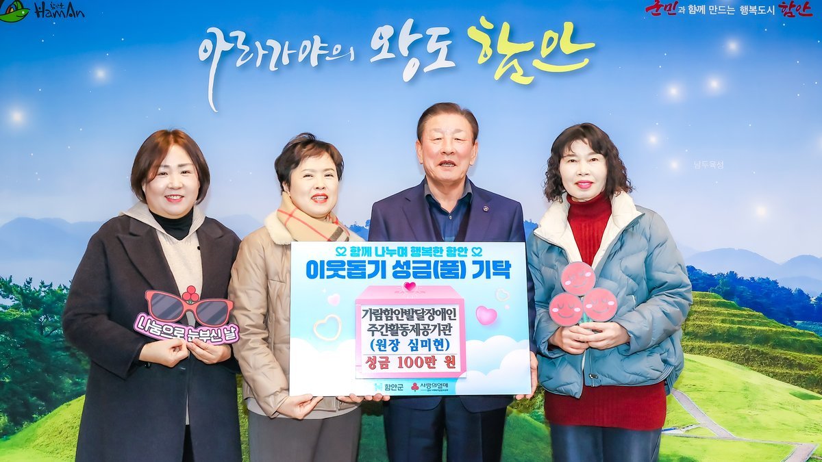 [한국Q뉴스] 함안군은 지난 8일 가람함안발달장애인 주간활동제공기관이 '제6회 함안애복지박람회'에서 마련한 수익금 100만 원을 지역사회에 기부했다고 밝혔다.