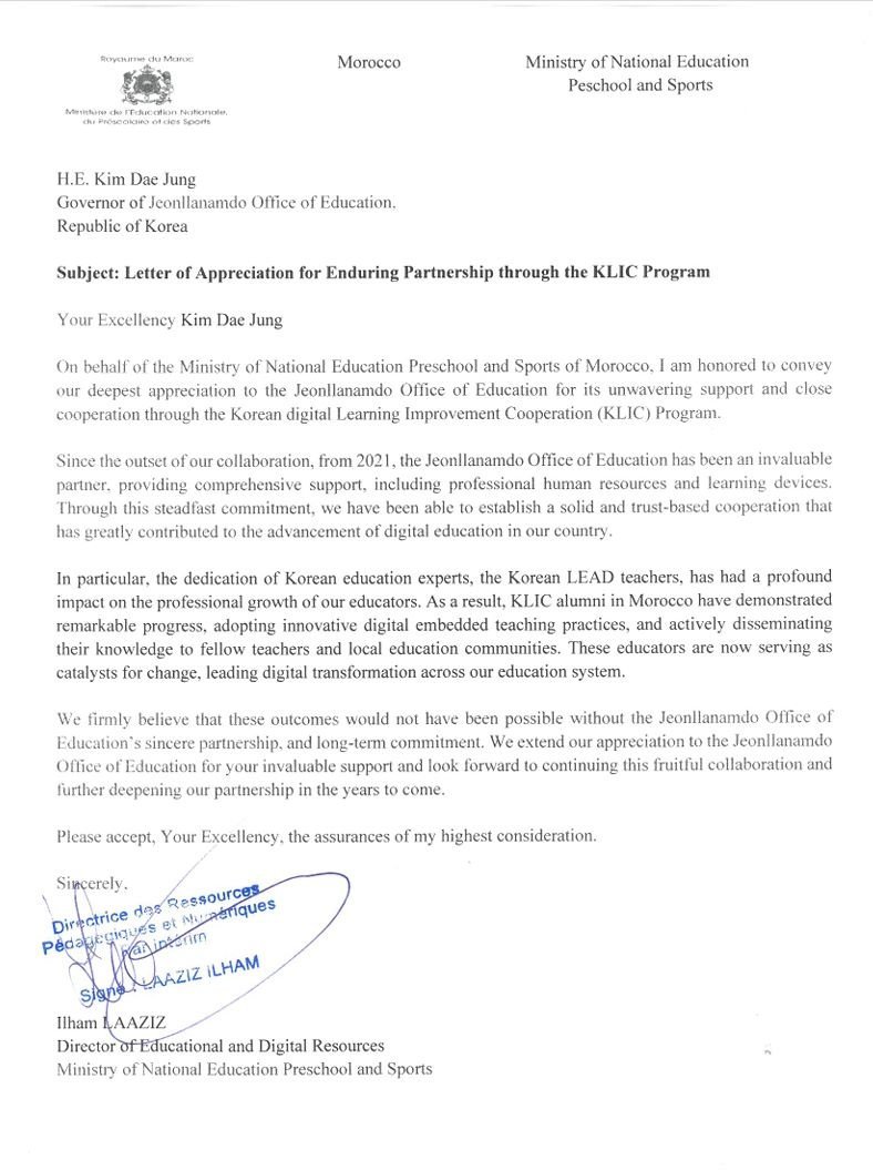 모로코 교육부는 서한을 통해 전남교육청이 단기적 지원을 넘어 장기적 관점에서 협력을 이어온 점에 깊은 감사를 표했다.