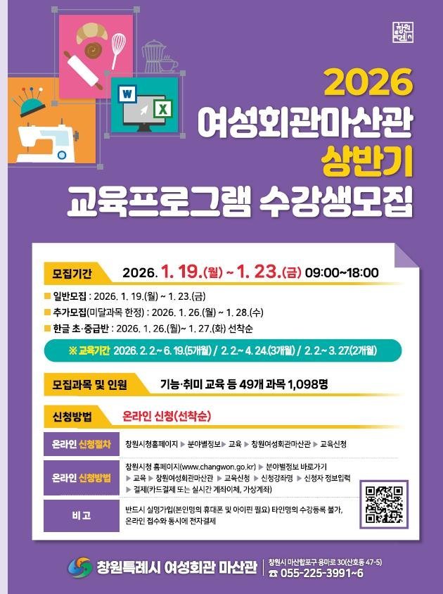 [한국Q뉴스] 창원특례시 여성회관 마산관은 1월 19일부터 1월 23일까지 2026년 상반기 교육프로그램 수강생을 모집하여 2월 2일부터 6월 19일까지 교육을 실시한다고 밝혔다.