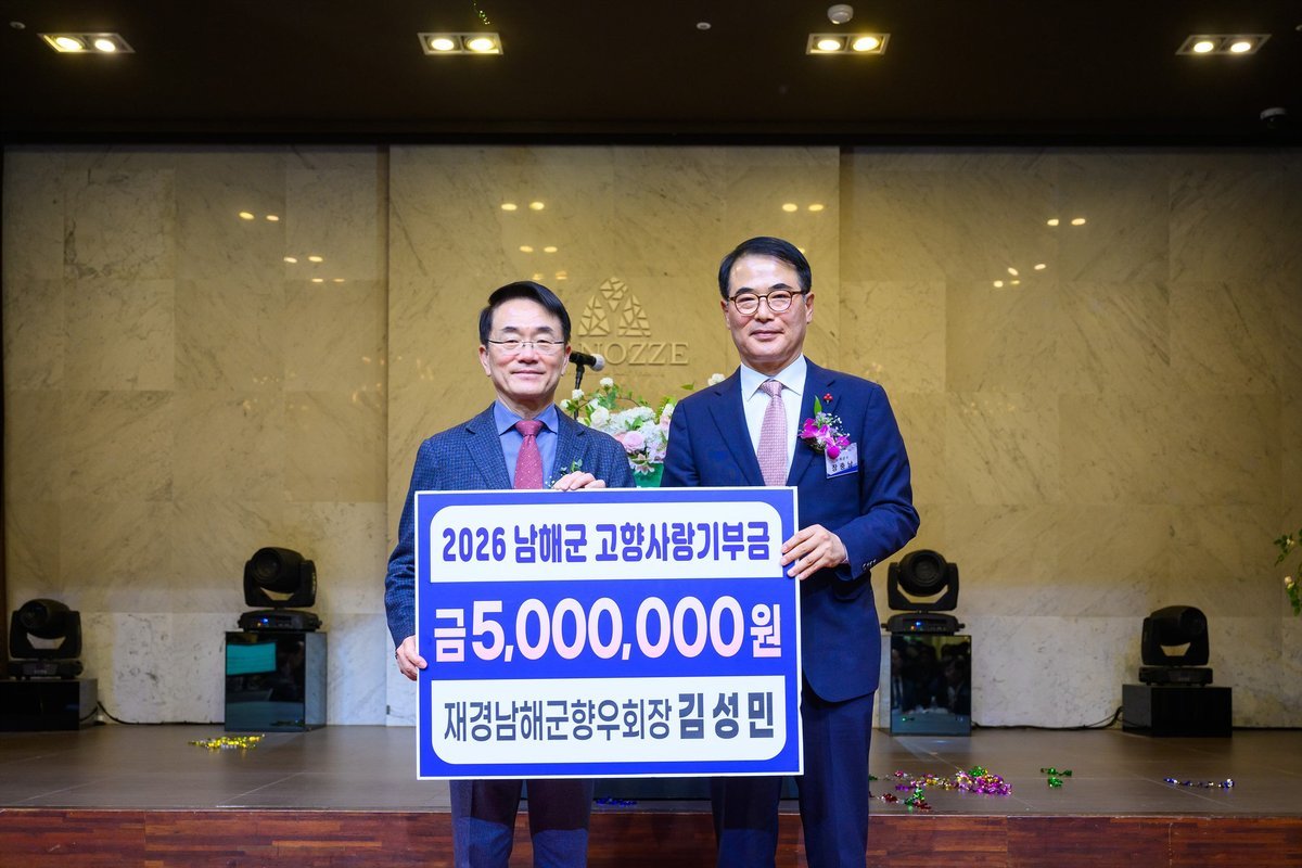 [한국Q뉴스] 재경남해군향우회 김성민 회장이 지난 6일 서울에서 열린 ‘2026년 재경향우회 신년하례회’에서 남해군의 발전을 위해 고향사랑기부금 500만 원을 기탁했다.