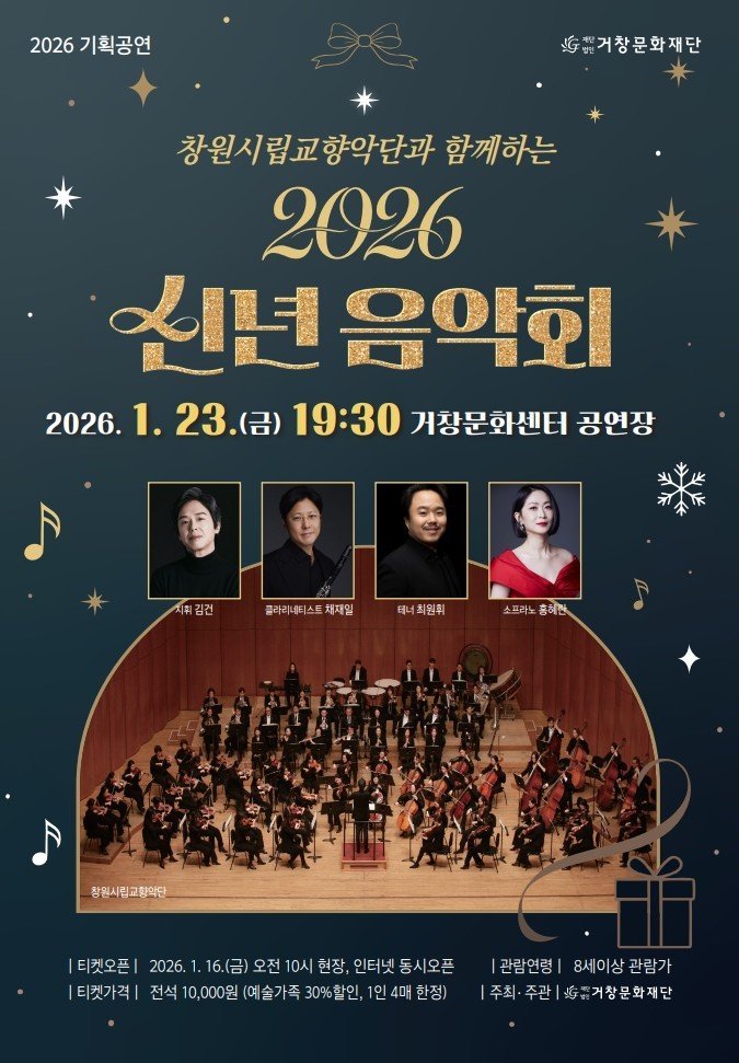 [한국Q뉴스] 거창문화재단은 오는 23일 19시 30분에 거창문화센터 공연장에서 창원시립교향악단과 함께하는 새해맞이 '2026 신년음악회'를 개최한다.