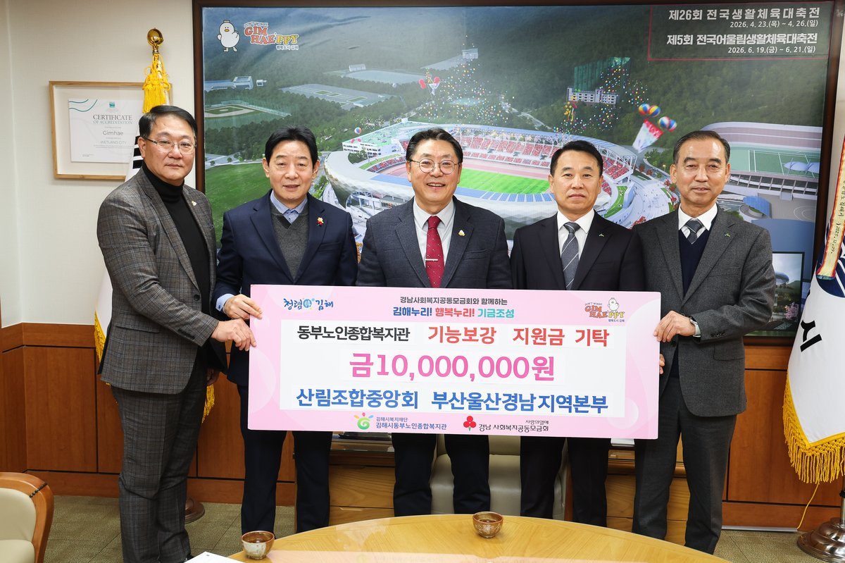 [한국Q뉴스] 김해시복지재단 김해시동부노인종합복지관에서는 지난 12일 산림조합중앙회 부산울산경남지역본부 시설보수 기능보강 지정기탁 금1000만원 전달식을 개최했다.