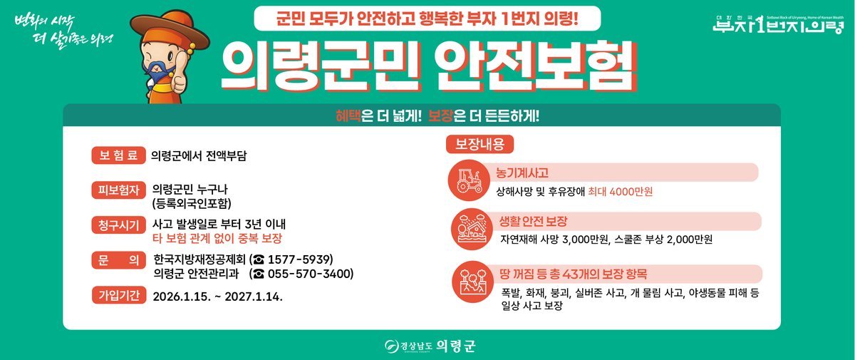 [한국Q뉴스] 의령군은 일상생활 중 예기치 못한 재난과 사고로부터 군민의 생활 안정을 지원하기 위해 '2026년 군민안전보험'에 갱신 가입하고, 1월 15일부터 본격 운영에 들어간다고 밝혔다.