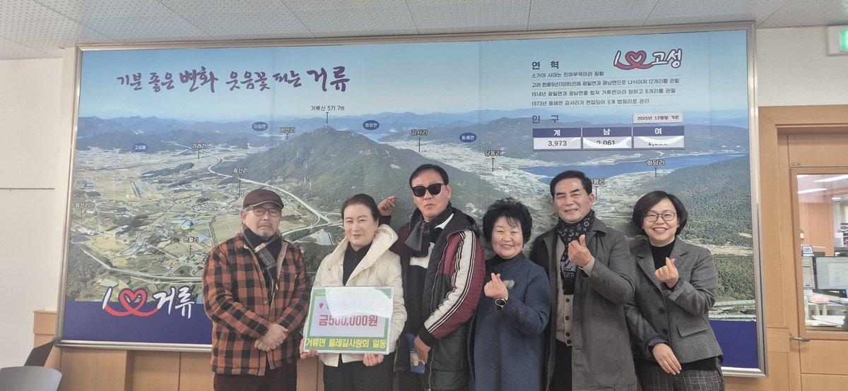 [한국Q뉴스] 고성군 거류면 둘레길사랑회는 1월 14일, 거류면사무소를 방문해 소외된 이웃에게 전달해 달라며 성금 50만 원을 기탁했다.