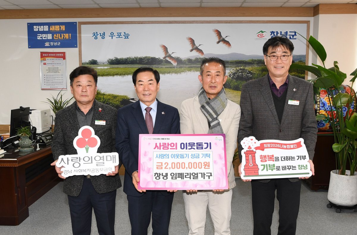 성낙인 군수는 "추운 겨울, 이웃을 위한 따뜻한 나눔을 실천해 주신 창녕 임페리얼가구에 깊이 감사드린다"며 "기탁해 주신 성금은 도움이 필요한 이웃들에게 소중히 전달하겠다"고 전했다.