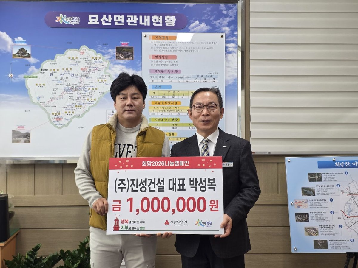 이창기 묘산면장은 "경기가 어려운 상황에서도 이웃을 위해 따뜻한 손길을 내밀어 주셔서 감사드린다"며 "기탁해 주신 성금은 도움이 필요한 이웃들에게 소중히 잘 전달하겠다"고 전했다.