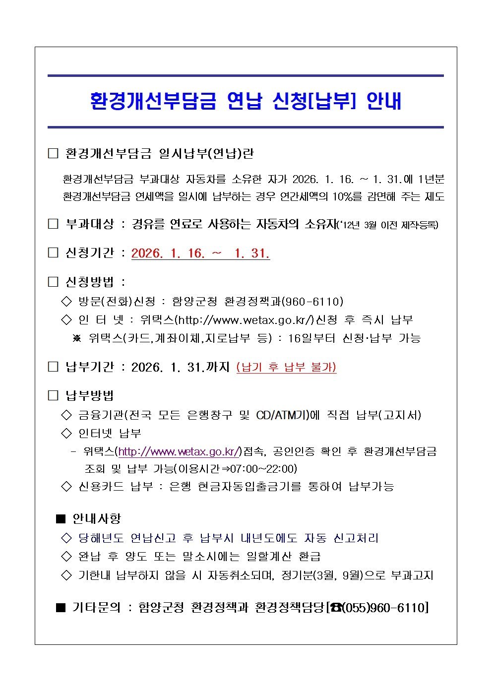 [한국Q뉴스] 함양군은 경유를 연료로 사용하는 자동차에 매년 3월과 9월 부과되는 환경개선부담금의 일시 납부를 1월 31일까지 접수 받고 있다.