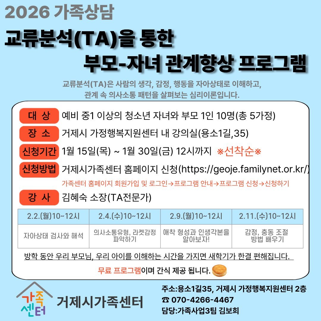 [한국Q뉴스] 거제시가족센터는 오는 2일부터 진행하는「교류분석을 통한 부모–자녀 집단상담 프로그램」 참여자를 모집한다고 밝혔다.