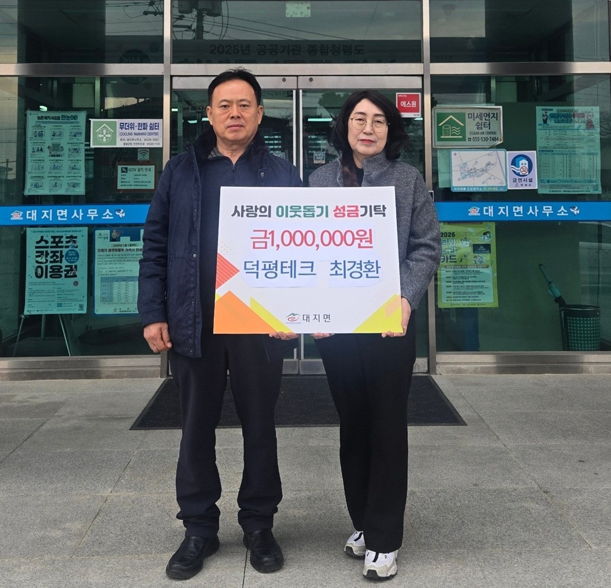 하연옥 면장은"매년 지역사회를 위해 따뜻한 나눔을 실천해주신 덕평테크 최경환 대표께 감사드린다"며 "기탁해주신 성금은 관내 취약계층을 위해 소중히 사용하겠다"고 말했다.