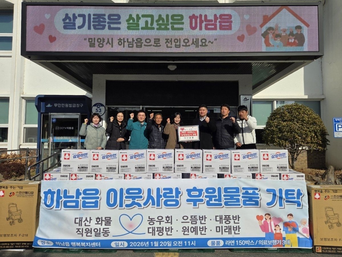 안선미 하남읍장은 "어려운 이웃을 위해 따뜻한 나눔을 실천해 주신 김상호 대산화물 소장께 깊이 감사드린다"며 "기탁된 물품은 지역 내 취약계층과 거동이 불편한 어르신들에게 소중히 전달하겠다"고 전했다.