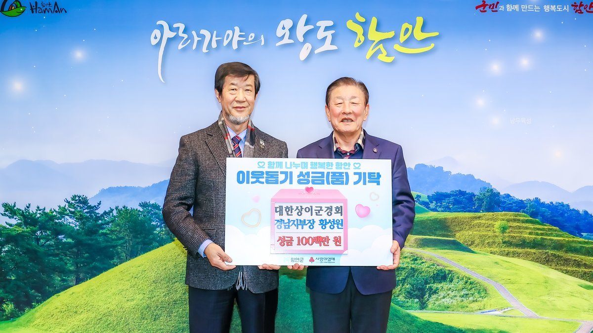 [한국Q뉴스] 함안군은 황성원 대한상이군경회 경남지부장이 관내 저소득계층을 돕기 위해 성금 100만원을 기탁했다고 밝혔다.