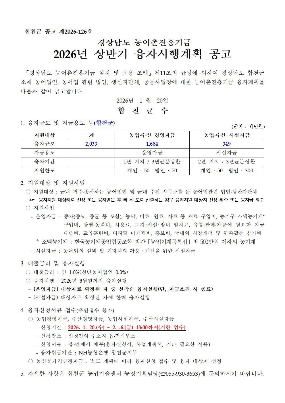 [한국Q뉴스] 합천군은 1월 20일부터 2월 6일까지 경상남도 농어촌진흥기금 융자 신청을 읍·면사무소에서 접수한다.