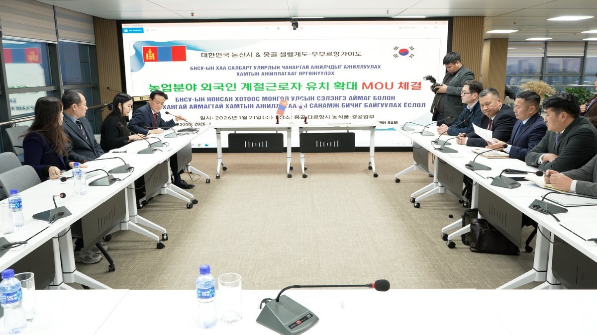 논산시는 21일 몽골 다르항시 농식품·경공업부에서 셀렝게도 및 우브르항가이도와 ‘농업분야 외국인 계절근로자 유치 확대를 위한 업무협약’을 체결했다.