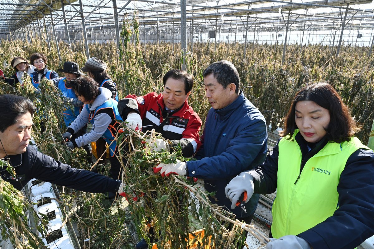 이날 자원봉사자들은 전국적인 한파 특보 속에서 피해 농가의 빠른 복구를 돕기 위해 시설하우스 내 방울토마토 고사주 정리와 수확 잔여물 처리 등을 하며 구슬땀을 흘렸다.