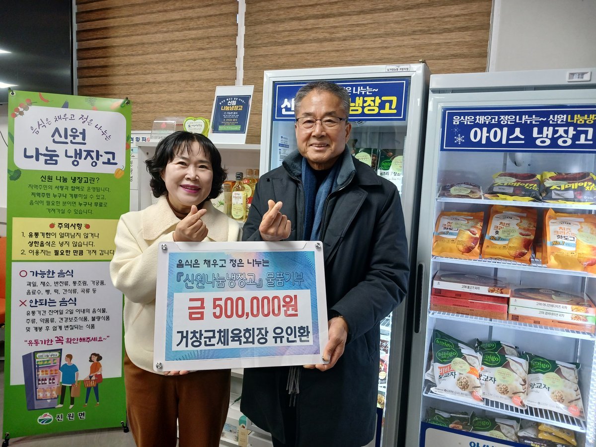 [한국Q뉴스] 거창군 신원면에서는 지난 22일 유인환 거창군체육회장이 신원 공유냉장고에 50만원 후원금을 전달해 큰 희망과 감동을 전했다고 밝혔다.