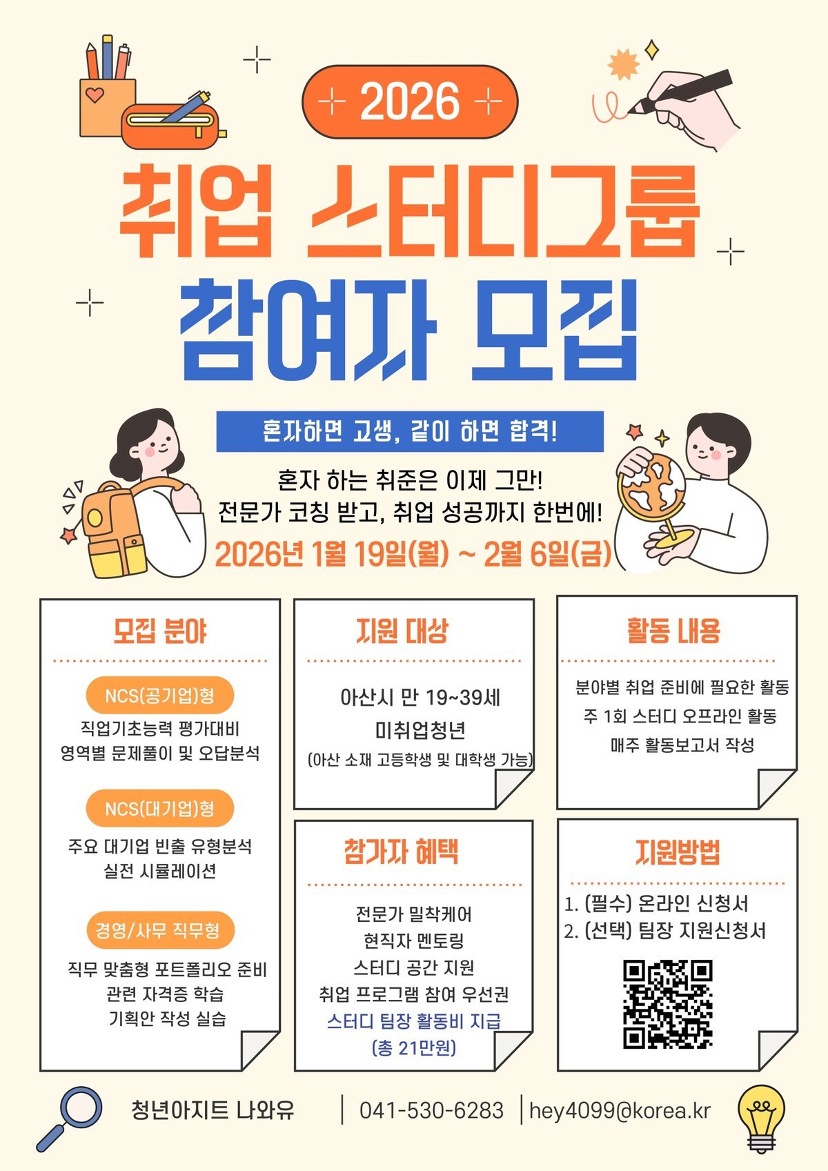 [한국Q뉴스] 아산시는 취업을 준비하는 청년들의 역량 강화를 지원하고 공통의 목표를 가진 청년 간 정보 공유를 활성화하기 위해 ‘2026년 청년 취업스터디그룹 지원사업’참여자를 모집한다고 밝혔다.
