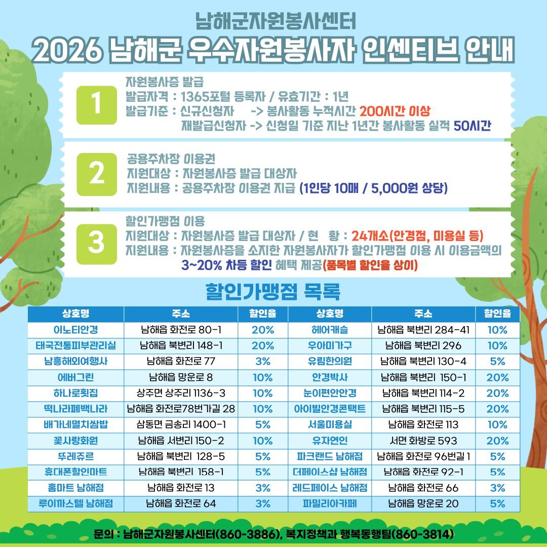 [한국Q뉴스] 남해군은 자원봉사 참여 활성화와 지속적인 참여를 유도하기 위해 연중 운영 중인 남해군 우수자원봉사자 인센티브 제도의 혜택을 확대하고자, 관내 할인가맹점 4개소를 추가했다고 밝혔다.