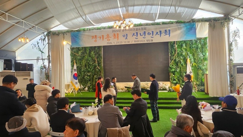 [한국Q뉴스] 충주시파크골프협회는 23일 충주 파라다이스 웨딩홀에서 협회 소속 37개 클럽 회장 및 임원, 협회 임원 등 160여명이 참석한 가운데 2026년 정기총회 및 신년인사회를 개최했다.