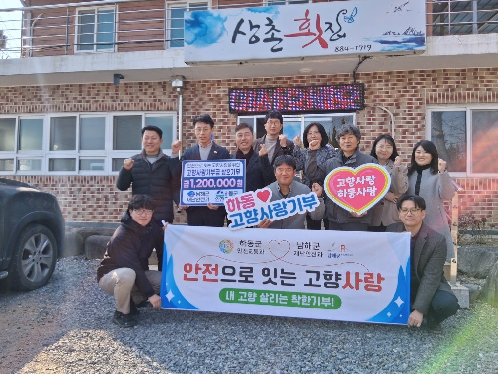 [한국Q뉴스] 지난 23일 하동군청 안전교통과와 남해군청 재난안전과가 고향사랑기부금 120만원을 주고받으며 지역 상생과 나눔 문화 확산에 앞장섰다.