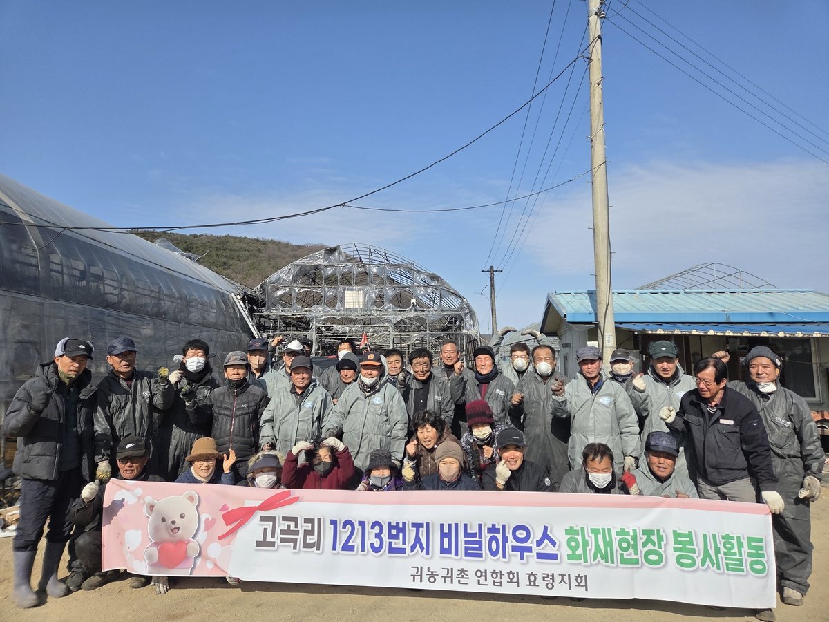 [한국Q뉴스] 군위군 효령면 귀농귀촌연합회, 효령사랑회, 고곡2리 주민들은 지난 1월 26일 고곡리 화재 피해 현장을 찾아 비닐하우스 철거 및 정비 봉사활동을 실시했다.