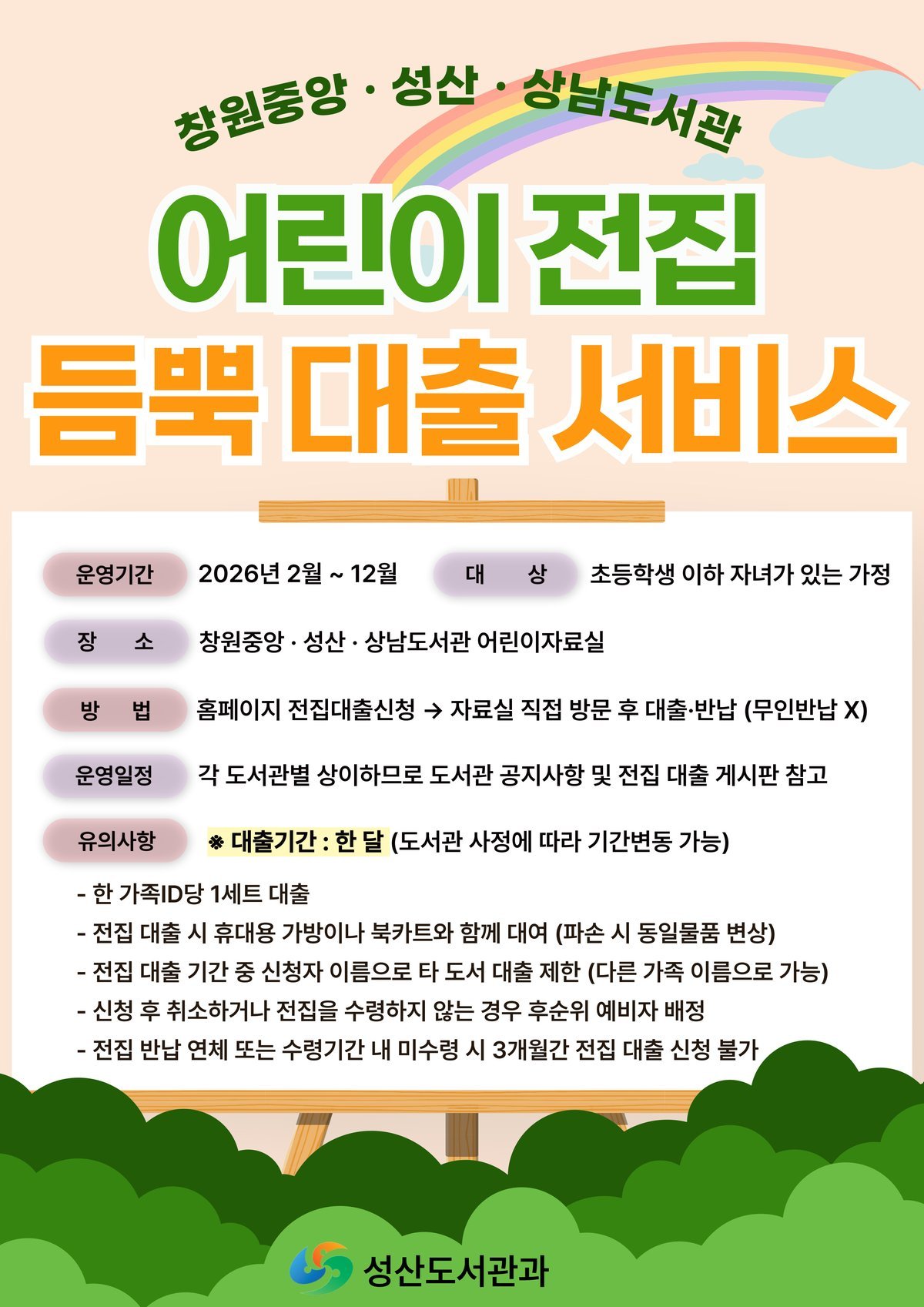 [한국Q뉴스] 창원특례시 도서관사업소 성산도서관과는 초등학생 이하 자녀를 둔 가정을 대상으로 도서 구입비 부담을 줄이고 독서 생활화를 지원하기 위해 어린이 전집 한 세트 전체를 한 달간 대출해주는 '듬뿍 대출 서비스'를 운영한다고 밝혔다.