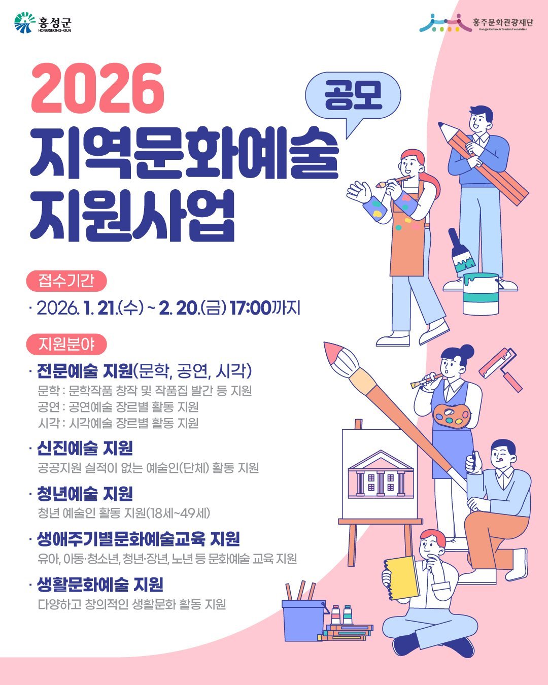[한국Q뉴스] 홍주문화관광재단은 홍성군 예술인과 예술단체의 창작활동을 활성화하고 군민 문화향유 기회 확대를 위해‘2026년 지역문화예술지원사업’공모를 진행한다.