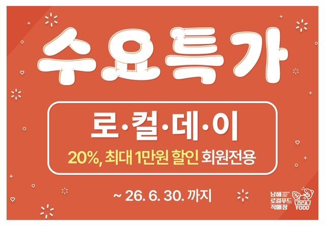 이홍정 유통지원과장은 “매주 수요일 로컬데이 혜택을 통해 남해의 신선한 먹거리를 더 부담 없이 즐기실 수 있길 바란다”며 “지역 농가와 소비자가 함께 웃을 수 있는 건강한 소비문화가 확산되도록 노력하겠다”고 말했다.