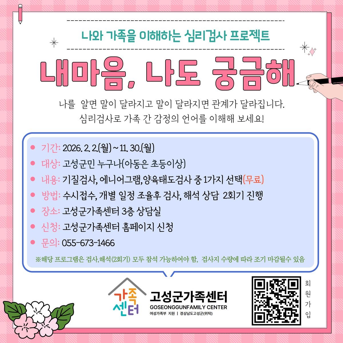 [한국Q뉴스] 고성군가족센터는 2월 2일부터 11월 30일까지 센터 3층 상담실에서 고성군민과 초등학생 이상 자녀를 둔 부모-자녀를 대상으로 심리검사 프로젝트 ‘내마음, 나도 궁금해’을 연중 운영한다고 밝혔다.