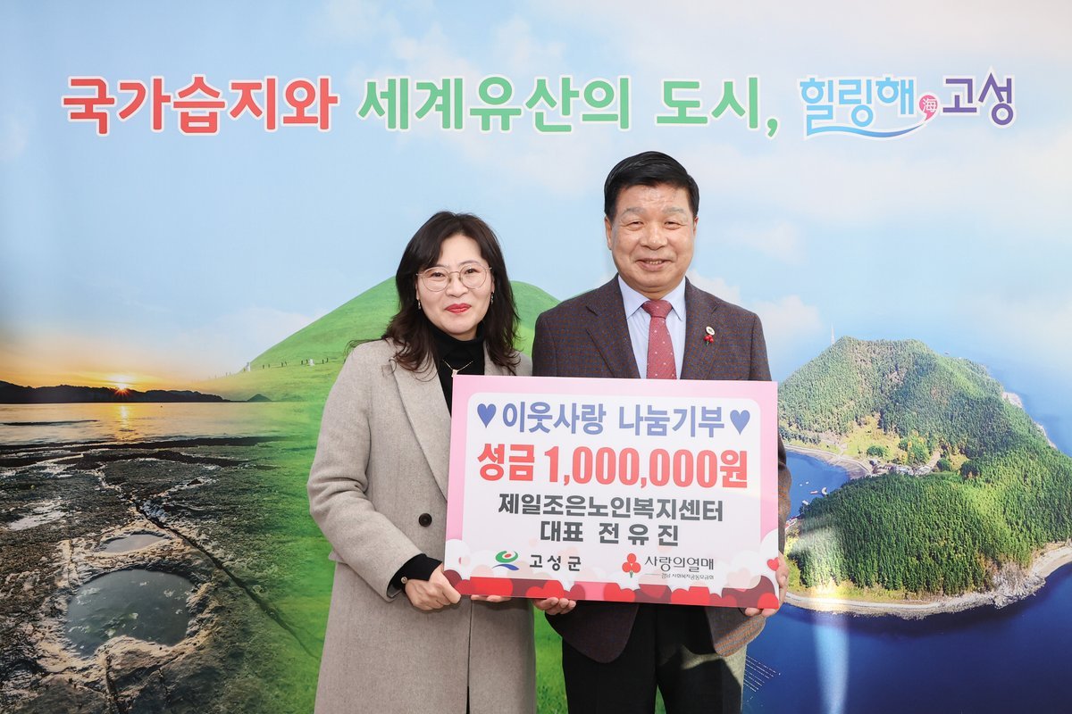 [한국Q뉴스] 고성군은 제일조은노인복지센터 전유진 대표가 1월 27일 고성군청을 방문해 저소득 취약계층 지원을 위해 성금 100만원을 기탁했다고 밝혔다.
