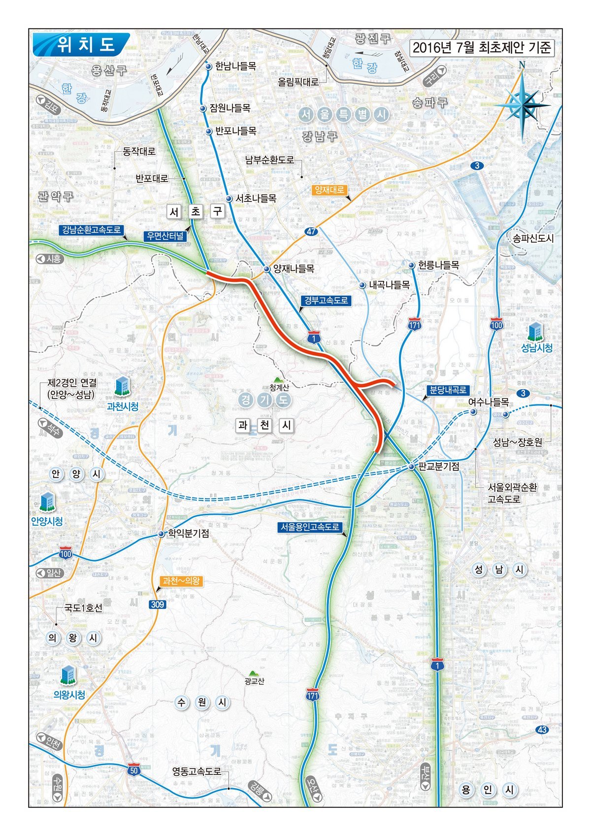 사업 구간은 경부고속도로와 용인서울고속도로가 만나는 판교 인근부터 우면산터널까지 약 10.7km로, 왕복 4차로로 조성된다. 추정 사업비는5,612억원이다.