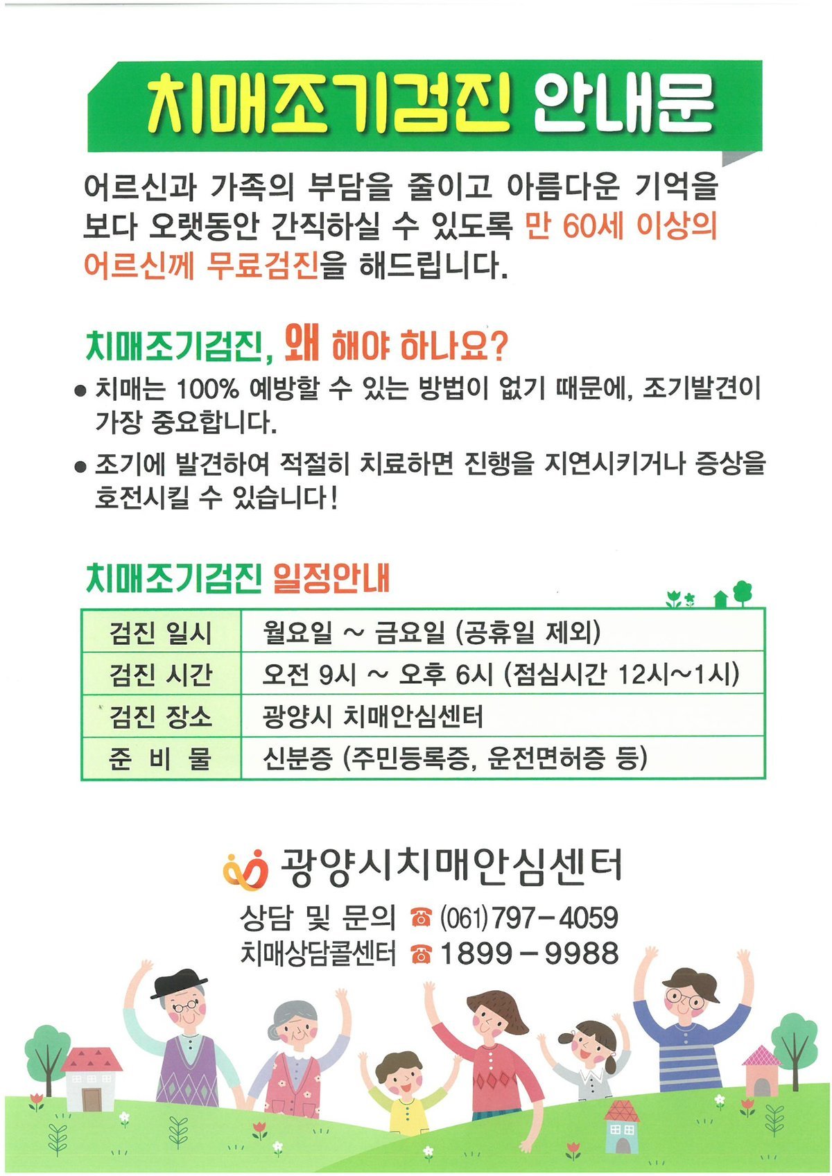 치매 초기에는 증상이 경미해 스스로 인지하기 어려운 경우가 많아, 정기적인 치매조기검진을 통해 기억력 저하 등 초기 변화를 확인하는 것이 중요하다. 이에 광양시치매안심센터는 특별한 증상이 없더라도 60세 이상 어르신의 경우 연 1회 정기적인 치매 조기검진을 받을 것을 권장하고 있다.