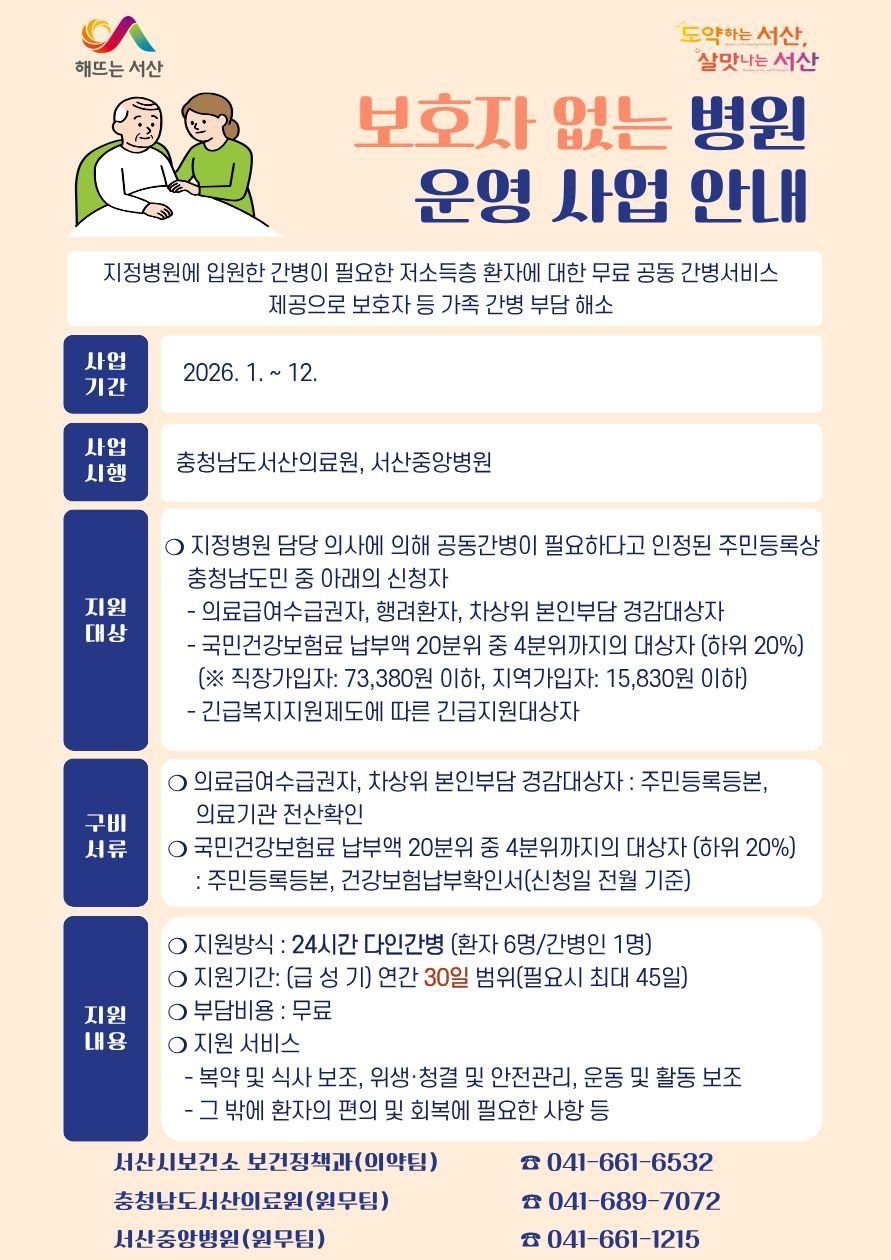 [한국Q뉴스] 충남 서산시가 저소득층 환자와 보호자의 간병 부담을 해소하기 위해 ‘보호자 없는 병원 사업’을 연중 운영 중이다.