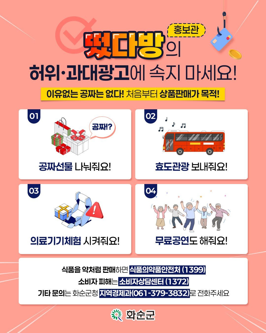 또한 피해가 생겼을 경우 식품안전 관련 위법행위는 식품의약품안전처, 소비자 피해는 소비자상담센터에서 신고할 수 있으며 기타 문의는 화순군청 지역경제과로 하면 된다.