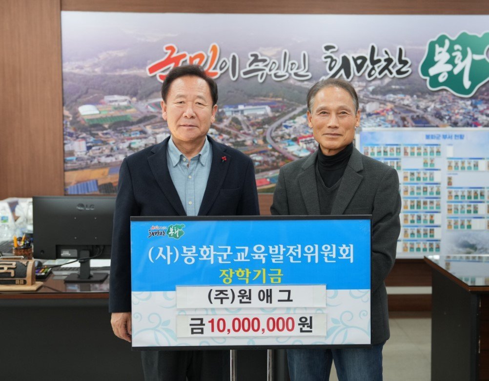 [한국Q뉴스] 봉화군에 소재한 ㈜원애그는 2월 4일 봉화군청을 방문해 지역 교육발전과 인재 육성을 위해 봉화군교육발전위원회에 장학금 1천만원을 기탁했다.