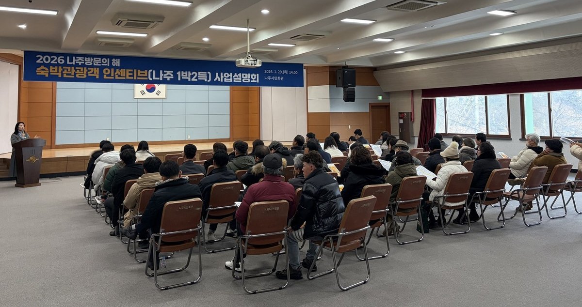 [한국Q뉴스] 나주시는 지난 29일 나주시민회관에서 관내 숙박업소를 대상으로 숙박관광 인센티브 지원사업 '나주 1박 2득'사업설명회를 개최했다고 30일 밝혔다.