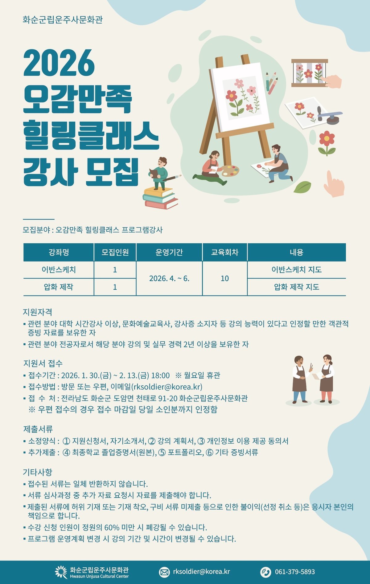[한국Q뉴스] 화순군은 화순군립운주사문화관에서 운영하는 2026년 '오감만족 힐링클래스'프로그램을 함께 이끌어갈 전문 강사를 오는 1월 30일부터 2월 13일까지 모집한다고 밝혔다.