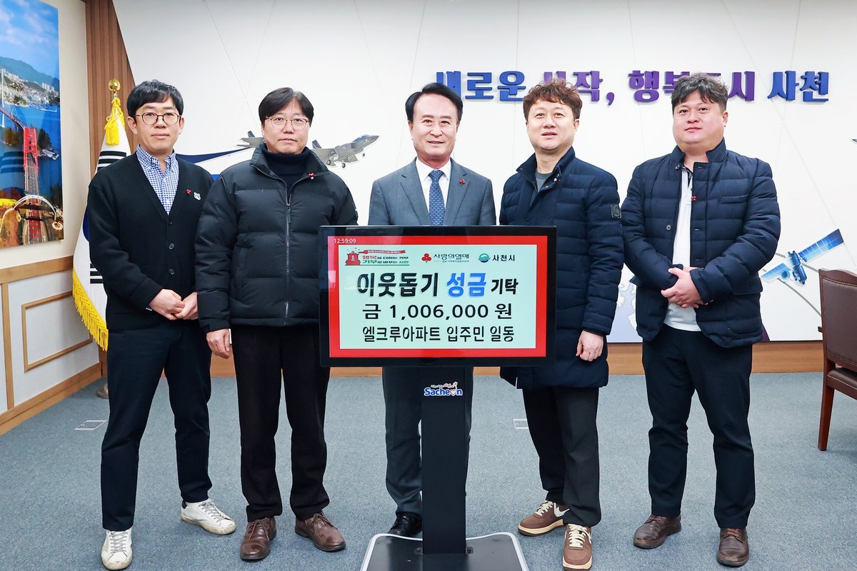 [한국Q뉴스] 사천 엘크루 아파트 입주민 일동는 지난 1월 29일 사천시청을 방문해 관내 저소득층을 돕기 위한 성금 100만6000원을 기탁했다.