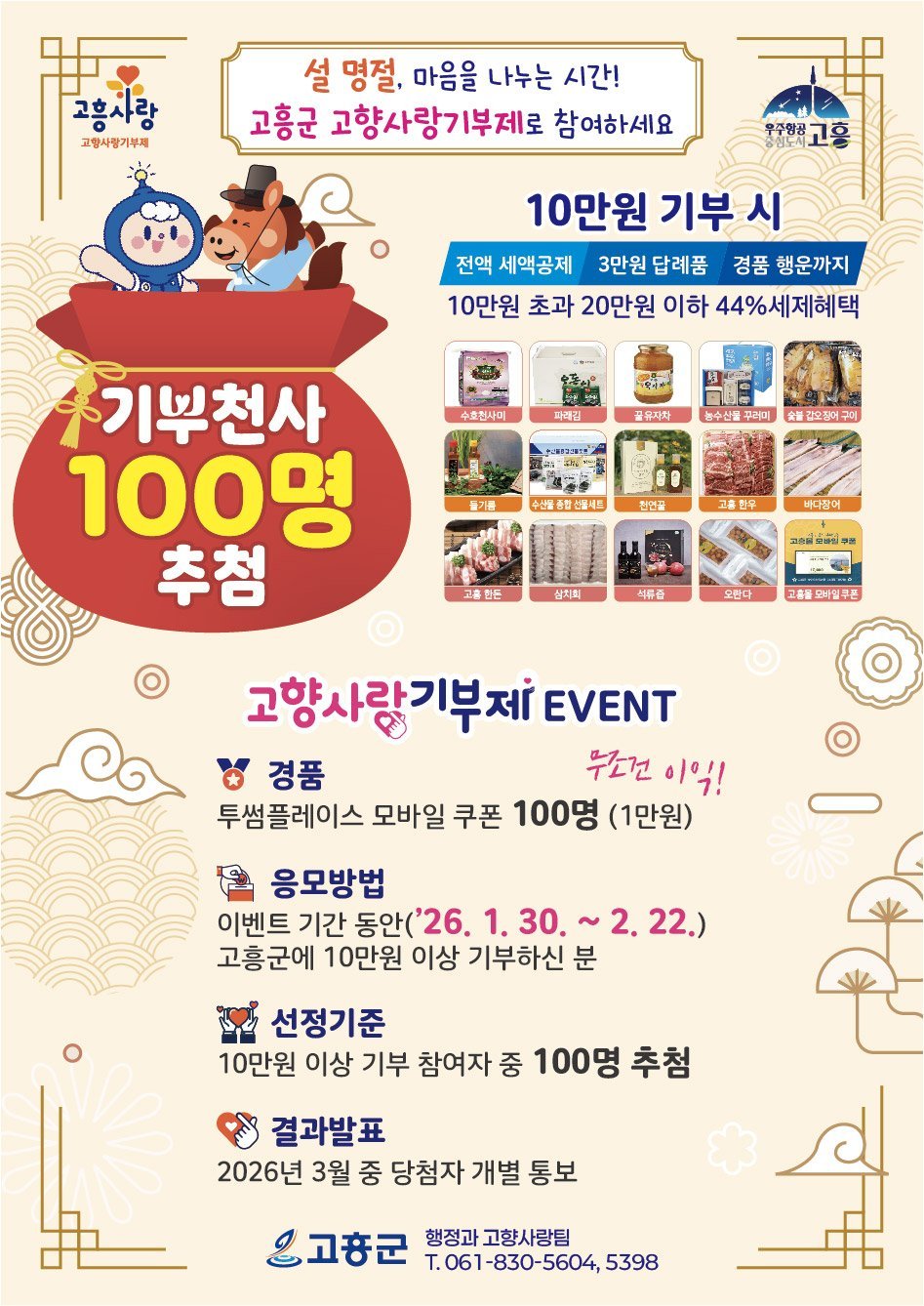 [한국Q뉴스] 고흥군은 2026년 고향사랑기부제 첫 참여 캠페인으로 설 명절을 맞아 1월 30일부터 2월 22일까지 ‘설맞이 고향사랑기부제 이벤트’를 운영한다고 밝혔다.