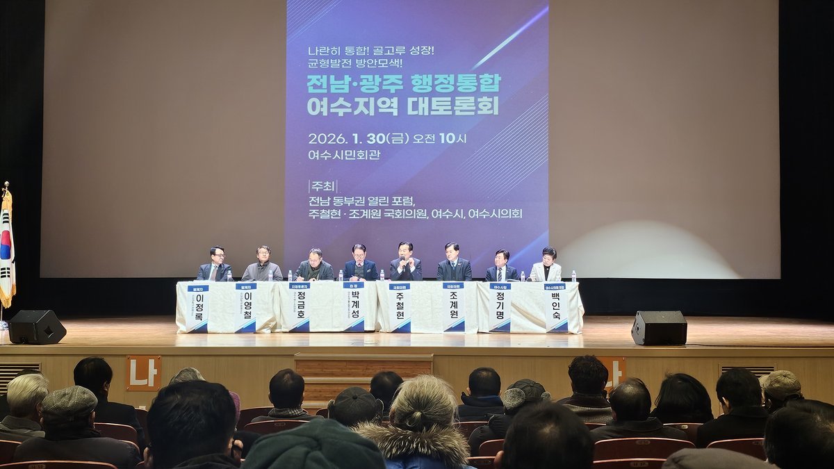[한국Q뉴스] 주철현·조계원 국회의원은 여수시, 여수시의회, 전남동부권 열린포럼과 함께 '전남·광주 행정통합 여수지역 대토론회'를 30일 여수시민회관에서 공동 개최하고 전남 동부권의 주요 현안과 행정통합 방향을 놓고 시민 의견을 수렴했다.