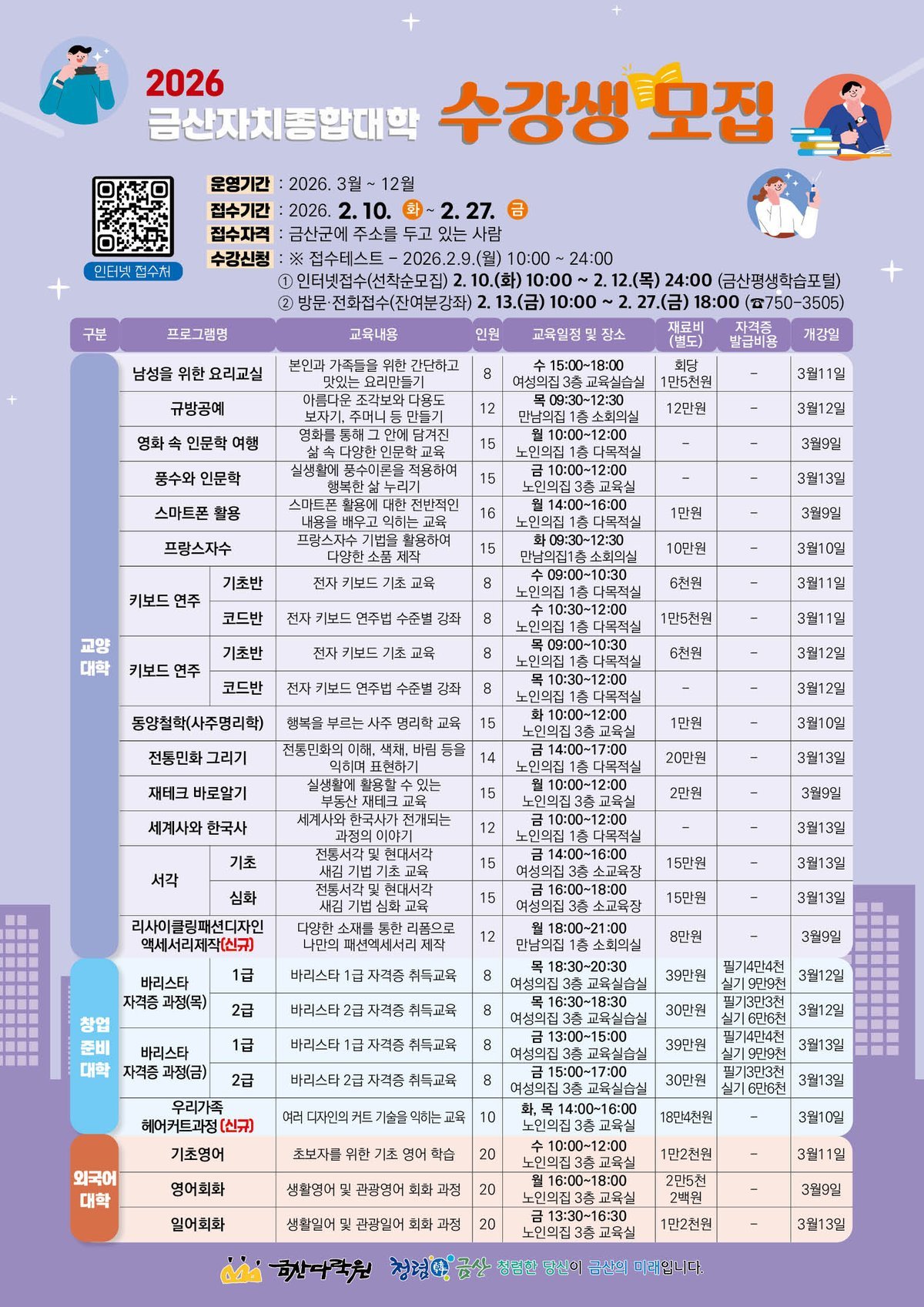 [한국Q뉴스] 금산다락원은 오는 2월 10일부터 27일까지 2026년 금산자치종합대학 3개 대학 수강생 313명을 모집한다.