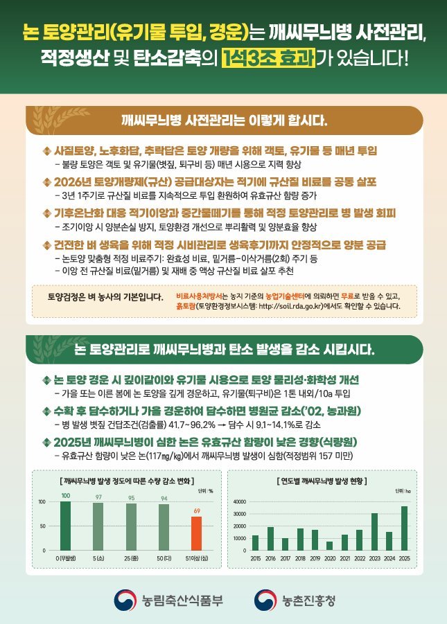 이와 함께 지역 여건에 맞는 조생종 또는 중생종 품종을 선택해 재배기간을 단축하고 출수 이후 고온기 노출 기간을 줄이면 깨씨무늬병 발생 위험을 낮출 수 있어 지역 적합 품종 선택이 중요하다.