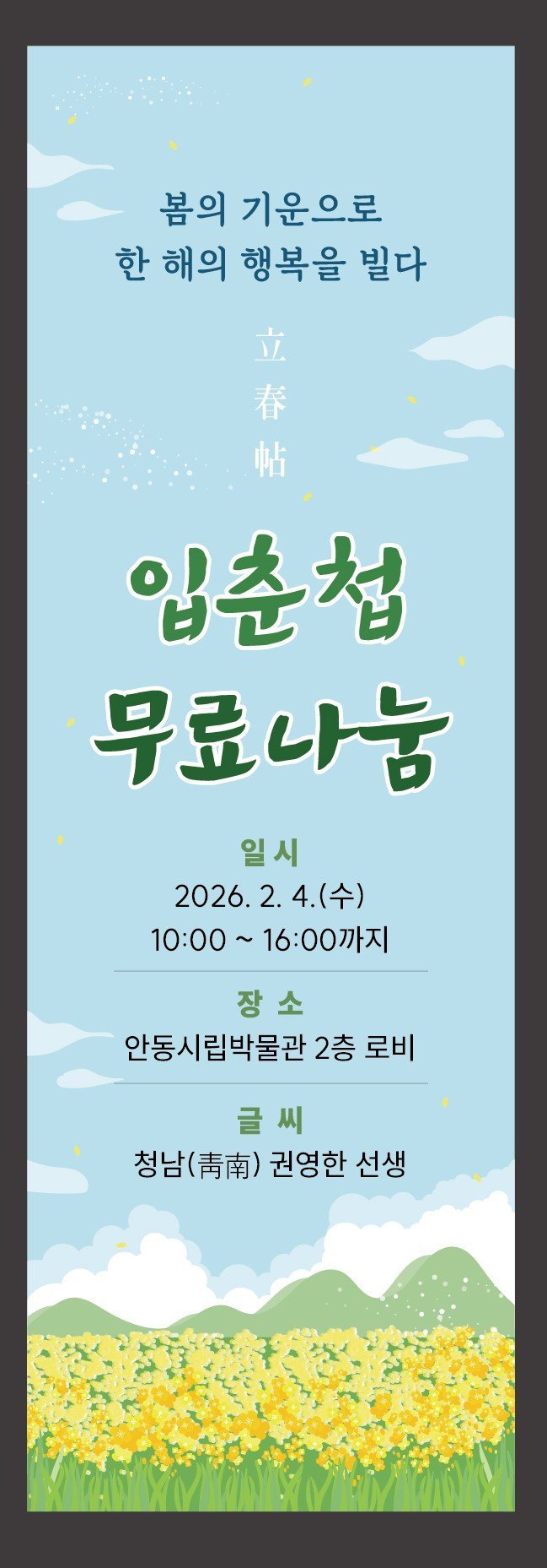 [한국Q뉴스] 안동시립박물관은 2026년 입춘을 맞아, 박물관을 찾는 관람객들을 대상으로 ‘입춘첩’무료 나눔 행사를 2월 4일 오전 10시부터 오후 4시까지 진행한다.