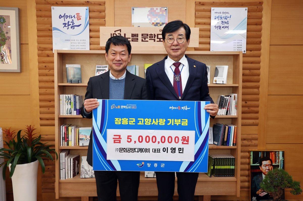 [한국Q뉴스] 이영민 ㈜문화공방디케이비 대표가 1월 29일 장흥군에 고향사랑기부금 500만원을 기탁하며 고향 발전에 깊은 애정을 표했다.
