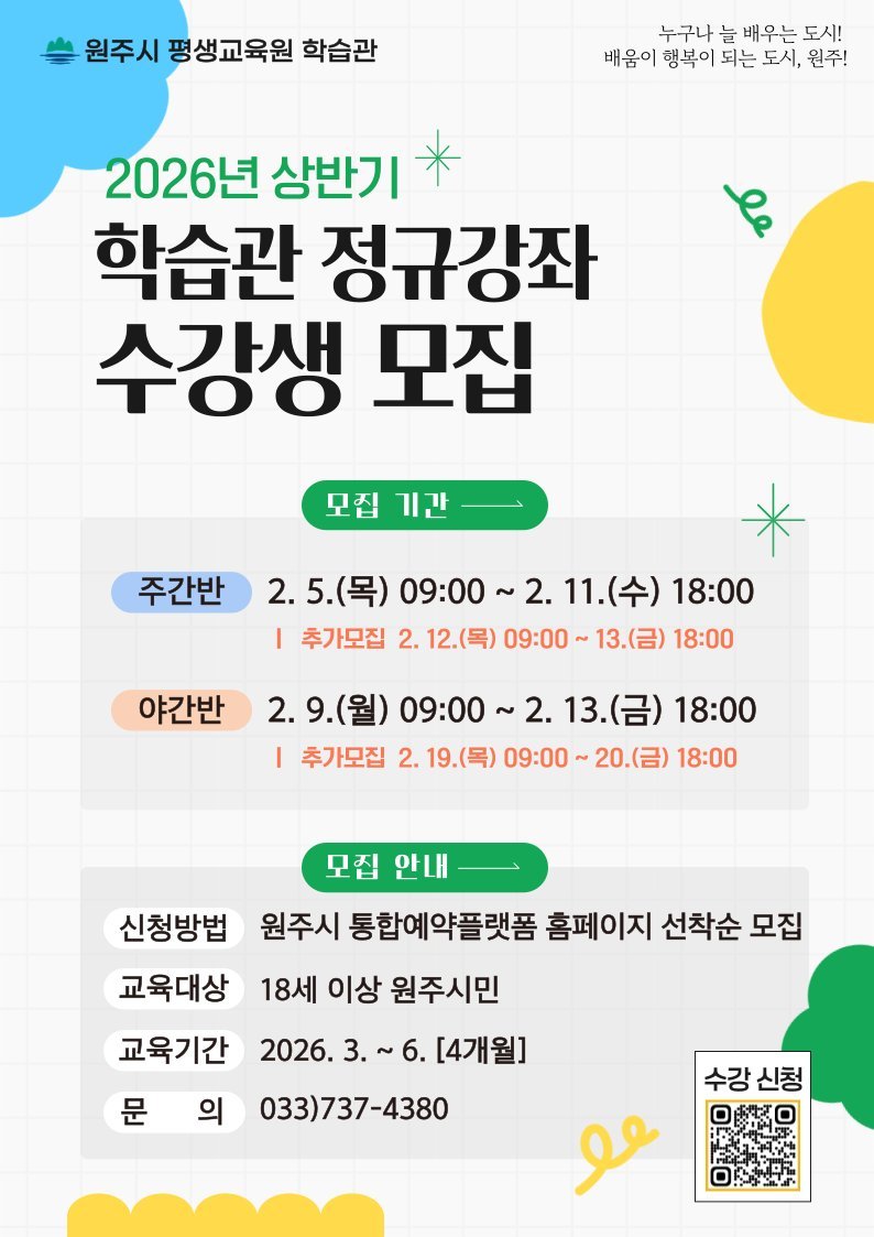 [한국Q뉴스] 원주시 평생교육원 학습관은 2026년 상반기 정규강좌 주·야간반 수강생을 모집한다.
